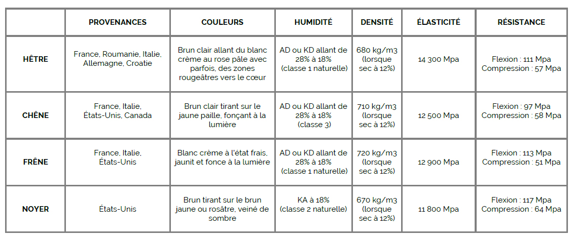 | ESSENCES | Hêtre | Chêne | Frêne | Cèdre | Noyer | Oregon | Tilleul | Châtaigner | Merisier | Robinier | Poirier |